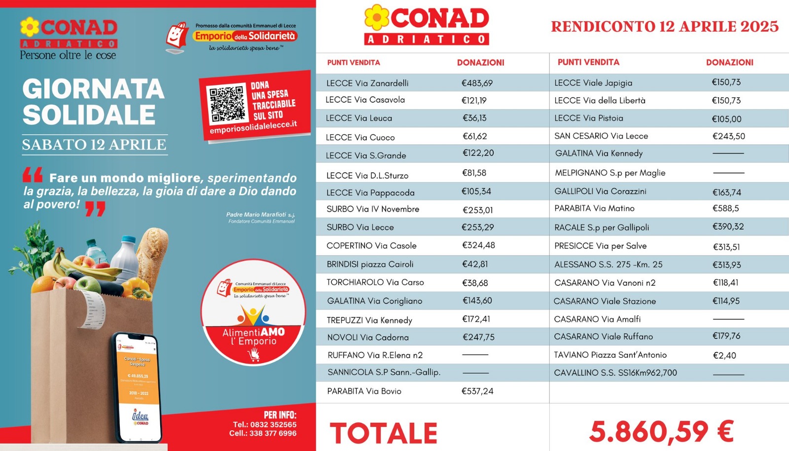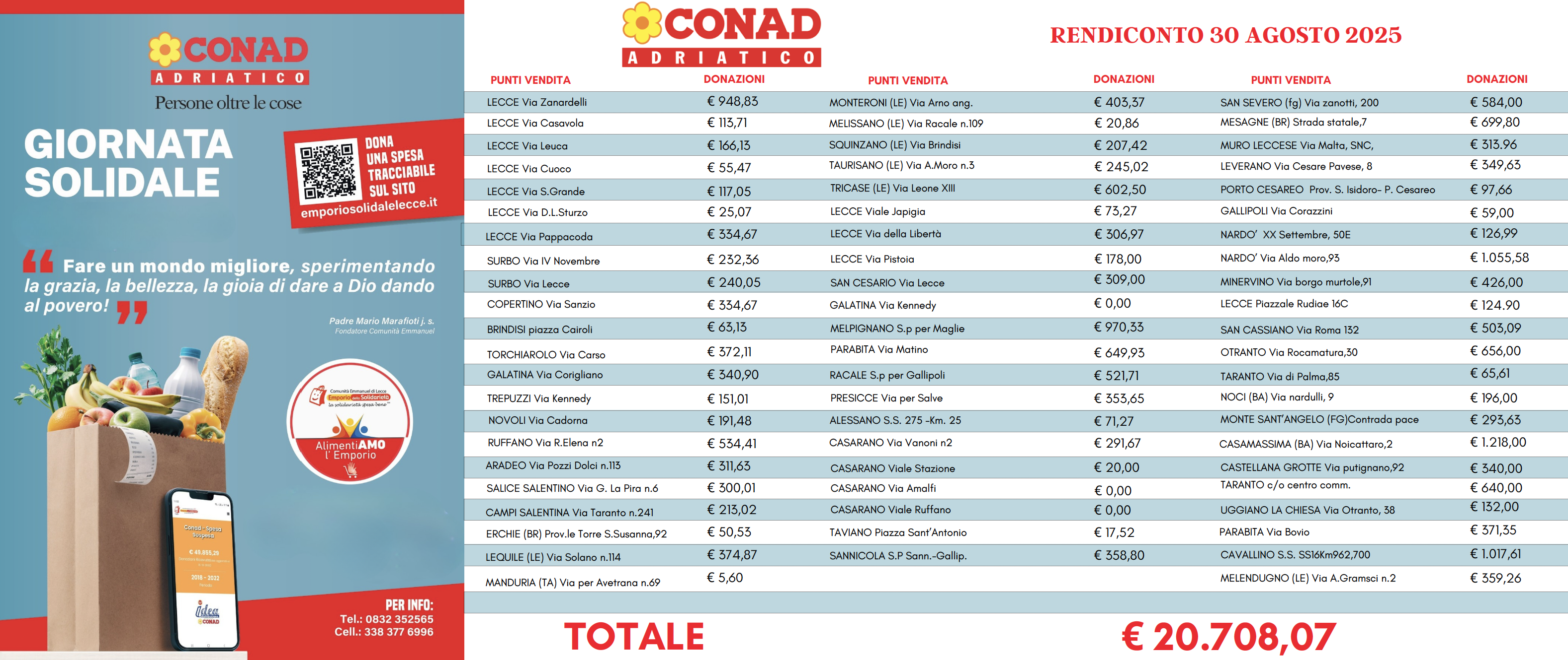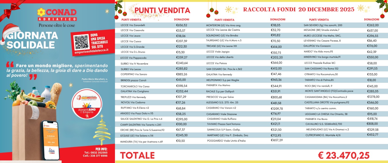 Oggi grazie ad un accordo siglato con Conad adriatico, altri 16 P.V. Conad del territorio aggiungono braccia e cuore a sostegno della raccolta fondi “Spesa sospesa”ogni primo sabato del mese, incentivando i loro clienti ad effettuare una libera donazione tracciabile sullo scontrino.